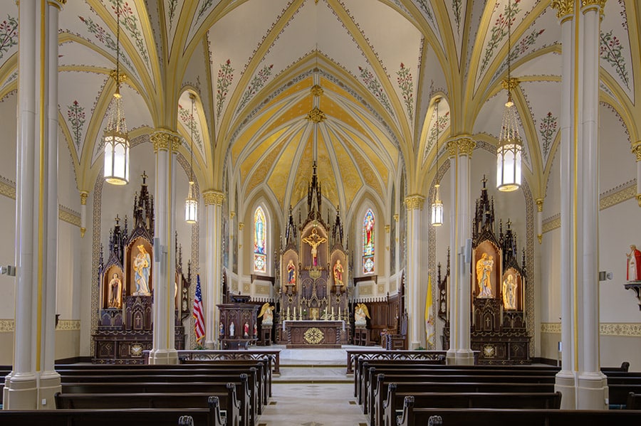 Renovation at St. Andrew Catholic Church in Tipton, Missouri is near completion. The doors were closed after Mass on August 18, 2024, and renovation began as artisans, tradesmen, and workers were busy restoring our church to its original architectural style. Mass was said in St. Andrew’s school gym for eight months with the last Mass being held on Holy Saturday, April 19, 2025. Parishioners met after Mass that evening to take everything over to the newly renovated church where the first Mass would be said on Easter Sunday, April 20, 2025.